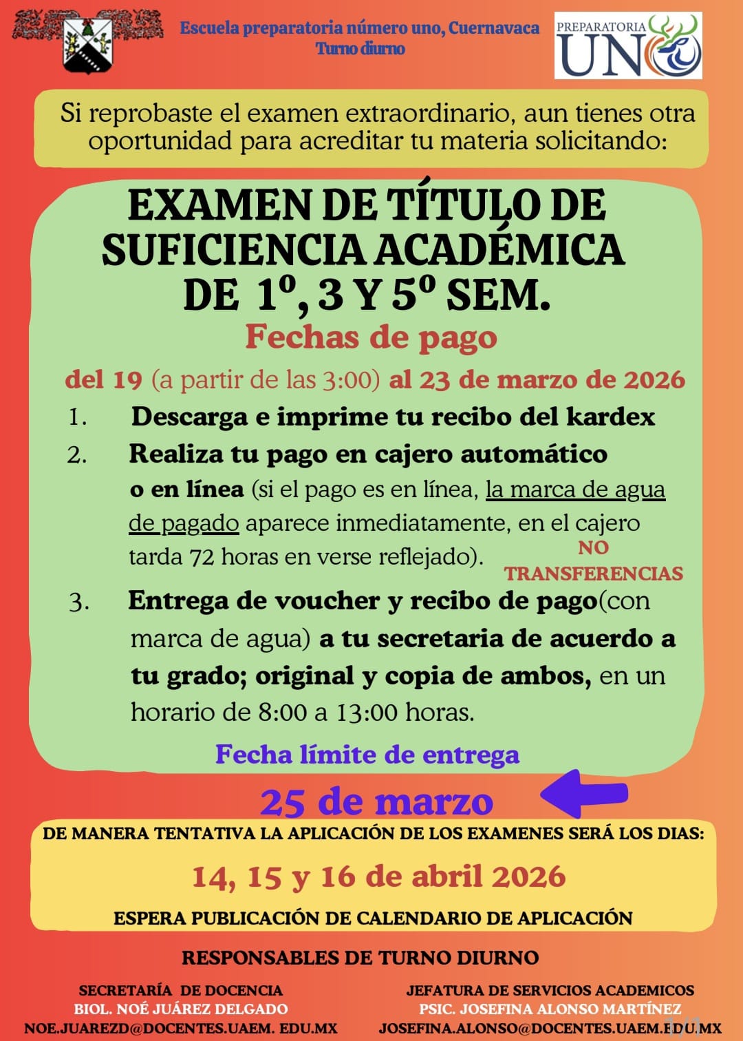 febrero 12, 2026 prepaunodiurna Avisos INFORMACIÓN DE PAGOS Y ENTREGA DE RECIBO EXAMEN EXTRAORDINARIO.