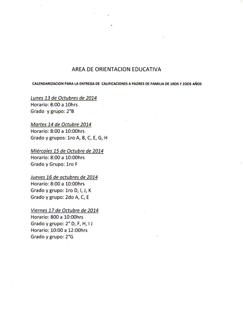 Estimados Padres de Familia, Les informamos de los horarios a los que les cita para poder revisar junto con el departamento de Orientación Educativa de nuestra institución las calificaciones del Primer Parcial del Primer y Segundo Grado.