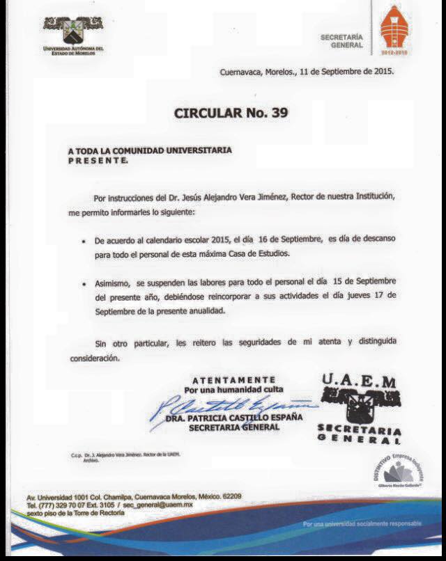Estimados Alumnos y padres de familia, les informamos que el día de hoy Lunes 14 de Septiembre suspendemos clases a las 11:00 am.