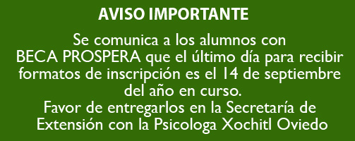 Se comunica a los alumnos con BECA PROSPERA que el último día para recibir formatos de inscripción es el 14 de septiembre del año en curso.