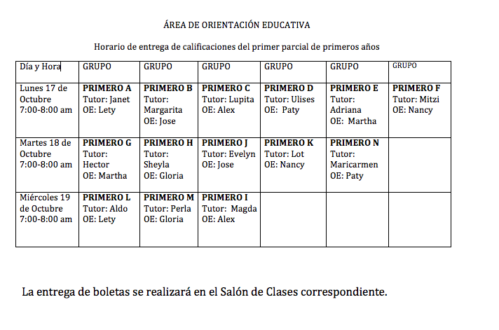 ATENCION PADRES DE FAMILIA, LES COMPARTIMOS EL CALENDARIO DE ENTREGA DE BOLETAS DE LOS GRUPOS DE PRIMER AÑO.