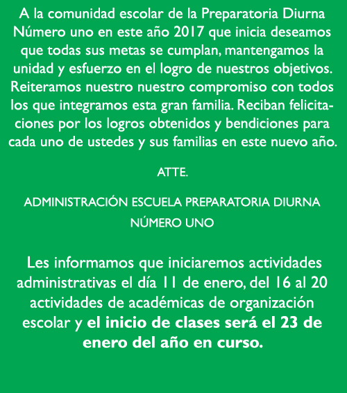 A la comunidad escolar de la Preparatoria Diurna Número uno en este año 2017 que inicia deseamos que todas sus metas se cumplan, mantengamos la unidad y esfuerzo en el logro de nuestros objetivos. Reiteramos nuestro nuestro compromiso con todos los que integramos esta gran familia. Reciban felicitaciones por los logros obtenidos y bendiciones para cada uno de ustedes y sus familias en este nuevo año.