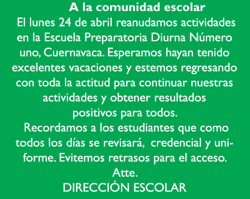El lunes 24 de abril reanudamos actividades en la Escuela Preparatoria Diurna Número uno, Cuernavaca. Esperamos hayan tenido excelentes vacaciones y estemos regresando con toda la actitud para continuar nuestras actividades y obtener resultados positivos para todos.