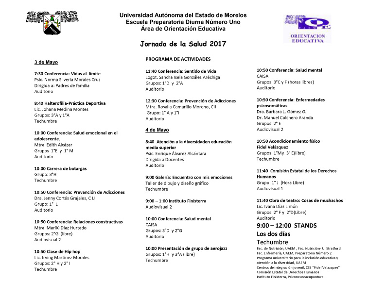 Les compartimos el programa de la Jornada de la salud, realizada por el departamento de orientación Educativa, donde se llevaran acabo actividades tanto de alumnos como padres de familia Comparte esto: Haz clic para compartir en X (Se abre en una ventana nueva) X Haz clic para compartir en Facebook (Se abre en una ventana nueva) Facebook Me gusta Cargando... Relacionado