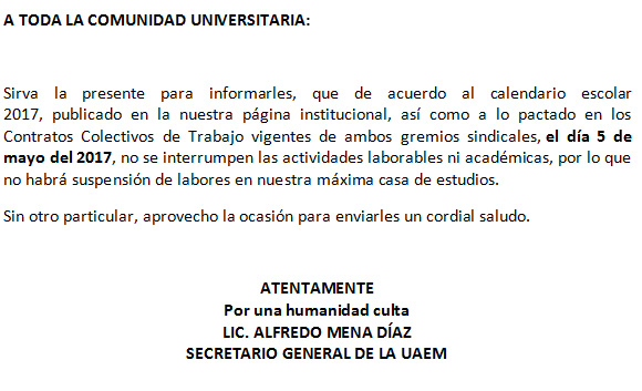 Les confirmamos que el día de mañana Viernes 5 de mayo si hay clases. Comparte esto: Haz clic para compartir en X (Se abre en una ventana nueva) X Haz clic para compartir en Facebook (Se abre en una ventana nueva) Facebook Me gusta Cargando... Relacionado