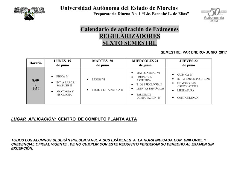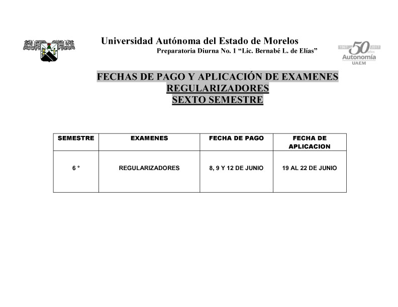 Calendario de pago y aplicación de los exámenes regularizadores para 6to semestre