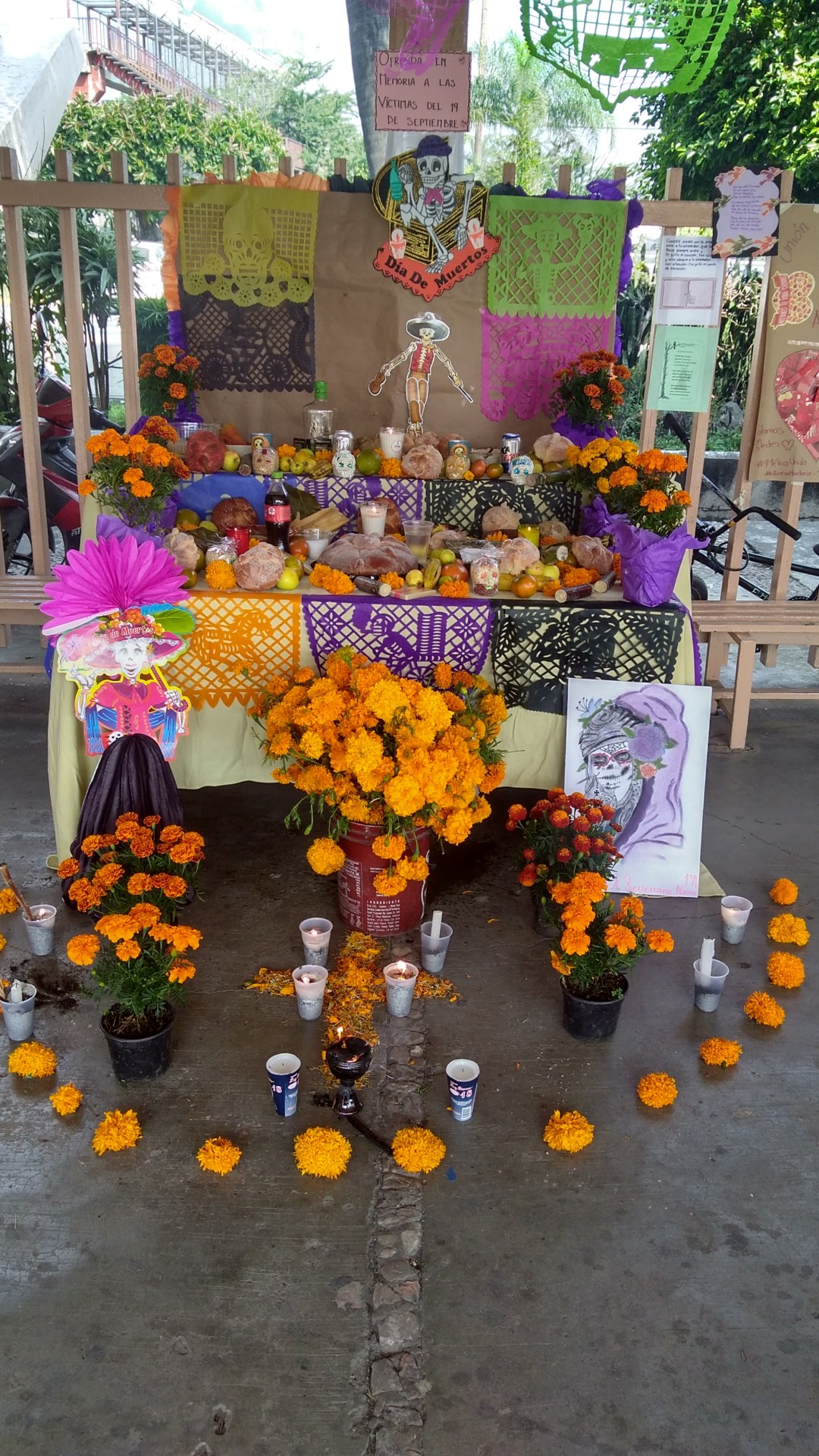 Los maestros se organizaron para montar una ofrenda en honor a nuestros difuntos y alumnos de distintos grados y grupos crearon calaveritas que fueron pegadas en varias partes de la escuela.