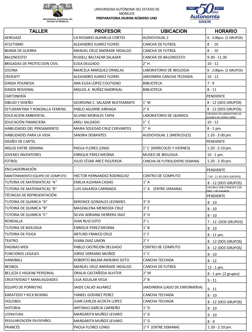 Les compartimos los horarios de los talleres del semestre par enero-junio 2018. Es importante que antes de inscribirse el día de mañana, ya identifiquen que taller van a cursar. Comparte esto: Haz clic para compartir en X (Se abre en una ventana nueva) X Haz clic para compartir en Facebook (Se abre en una ventana nueva) Facebook Me gusta Cargando... Relacionado