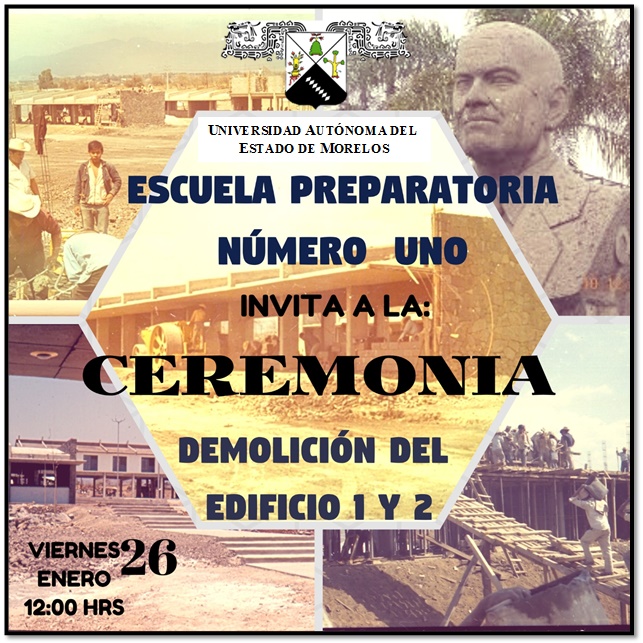 Hacemos la atenta invitación a padres de familia, alumnos, egresados, docentes y trabajadores jubilados y comunidad en general, a participar en la ceremonia de demolición del edificio 1 y 2 que se llevará a cabo el viernes 26 de enero a las 12:00. Comparte esto: Haz clic para compartir en X (Se abre en una ventana nueva) X Haz clic para compartir en Facebook (Se abre en una ventana nueva) Facebook Me gusta Cargando... Relacionado