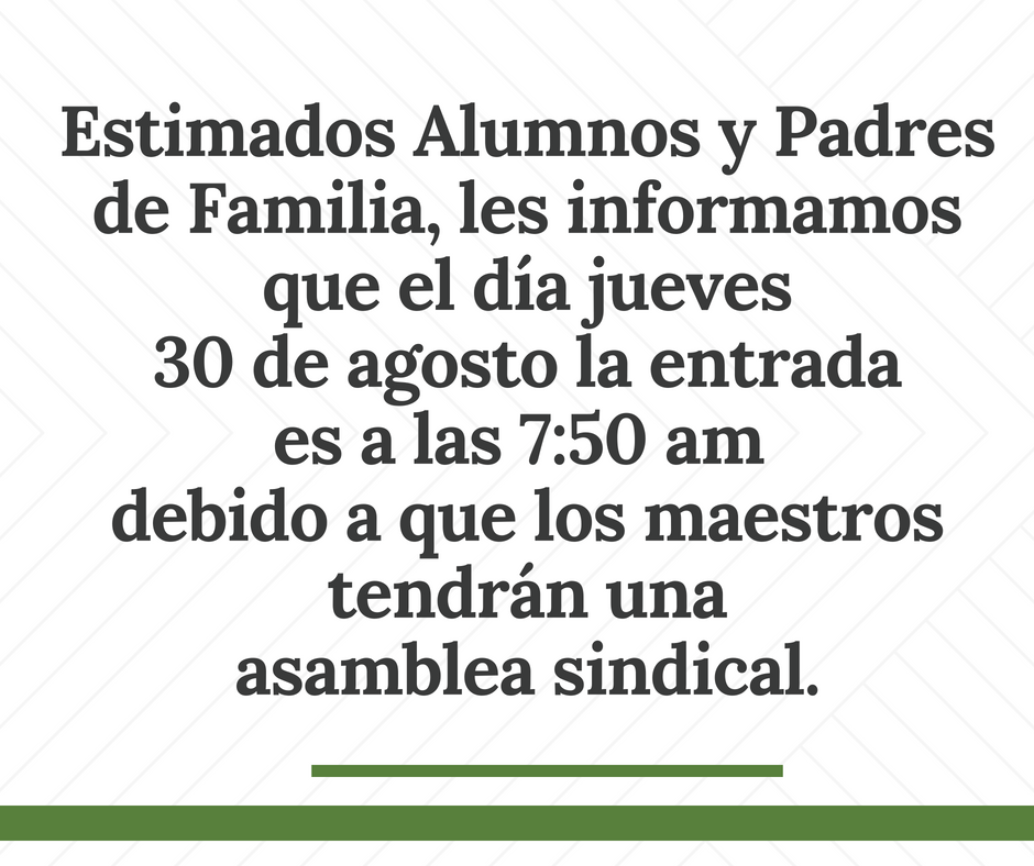 Estimados Alumnos y Padres de Familia, les informamos que el día jueves 30 de agosto la entrada es a las 7:50 debido a que los maestros tendrán una asamblea sindical. Atte. La Dirección Escolar Comparte esto: Haz clic para compartir en X (Se abre en una ventana nueva) X Haz clic para compartir en Facebook (Se abre en una ventana nueva) Facebook Me gusta Cargando... Relacionado