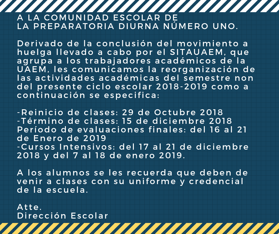 Derivado de la conclusión del movimiento a huelga llevado a cabo por el SITAUAEM, que agrupa a los trabajadores académicos de la UAEM, les comunicamos la reorganización de las actividades académicas del semestre non del presente ciclo escolar 2018-2019 como a continuación se especifica: