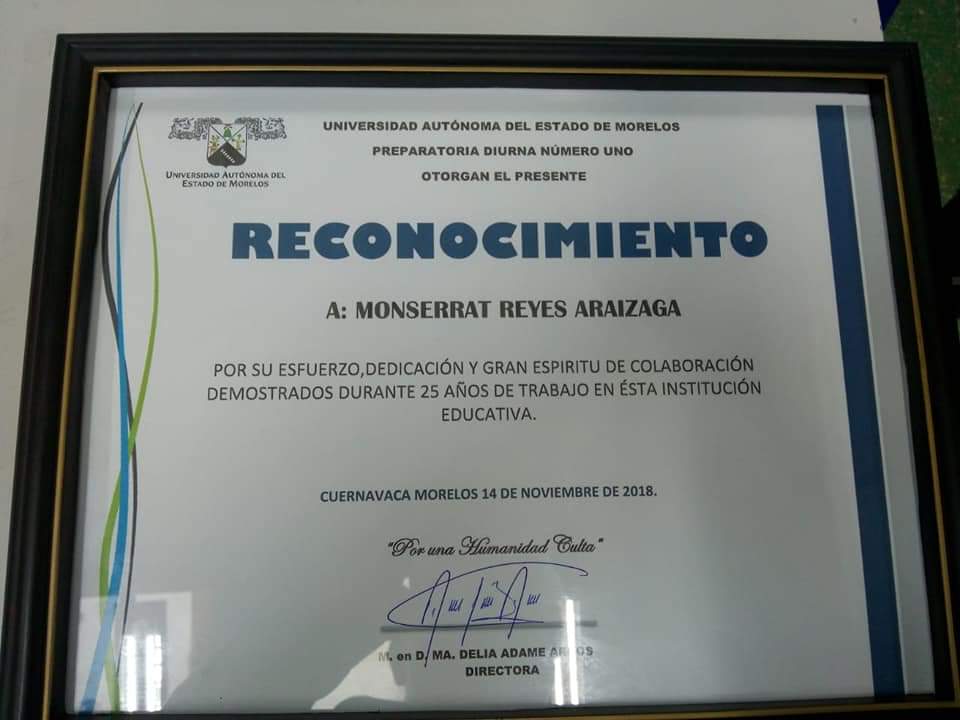 La administración de la Escuela Preparatoria Diurna Número uno felicita y Agradece a Montserrat Reyes Arraizaga 25 años de servicio a la institución quien hasta el día de hoy llevó a cabo sus actividades con calidad y calidez mostrando siempre su espíritu de colaboración. Al jubilarse estamos seguros que cualquier proyecto que inicie tendrá éxito.