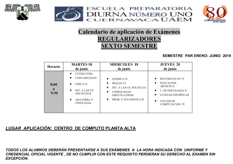 Les compartimos el calendario de aplicación de los exámenes regularizadores para 6to semestre. Recuerden que hoy es el último día para realizar el pago y la entrega de recibos es el 13 y 14 del presente mes. Atte. Secretaría de Docencia Comparte esto: Haz clic para compartir en X (Se abre en una ventana nueva) X Haz clic para compartir en Facebook (Se abre en una ventana nueva) Facebook Me gusta Cargando... Relacionado