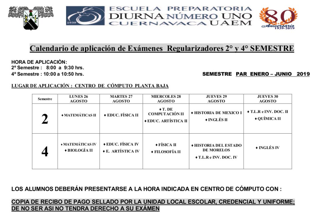 Estimados alumnos y padres de familia les compartimos el calendario de exámenes extraordinarios (antes regularizadores) que comienzan el próximo lunes 26 de Agosto 2019.