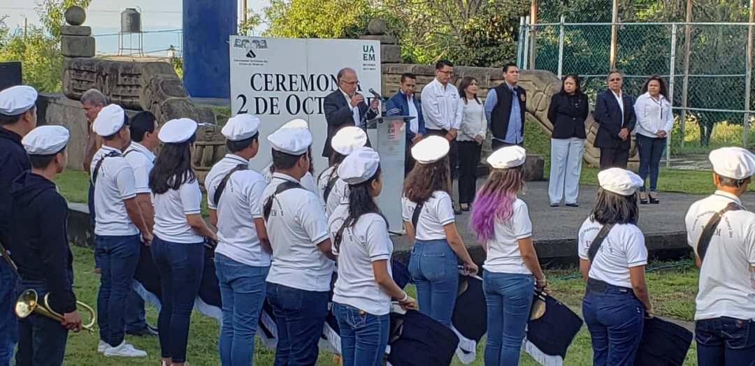 Participación de la Banda de Guerra de la Escuela Preparatoria Diurna número uno en la Ceremonia conmemorativa del 2 de octubre en la UAEM.