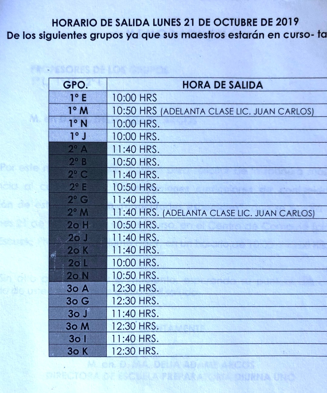Por lo que les pedimos revisar en la imagen si el grupo de sus hijos saldrá en horario normal o si sus actividades terminaron antes.
