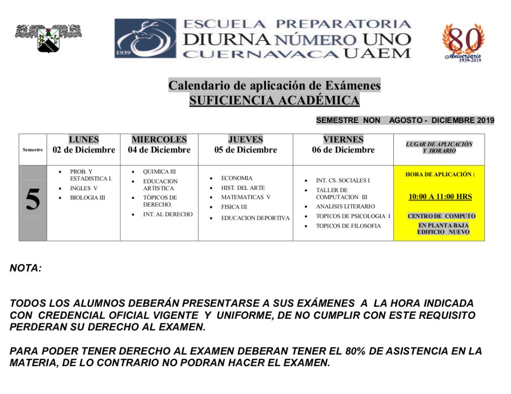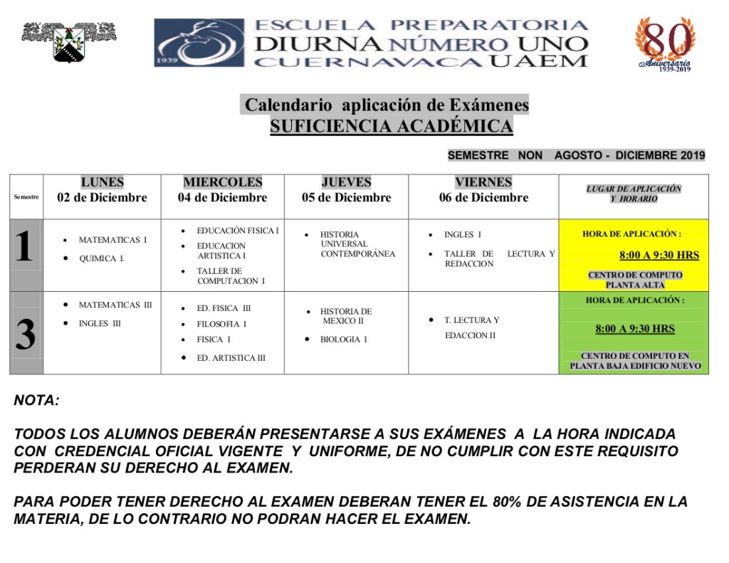 Les compartimos el calendario de los exámenes de suficiencia, que comienza el próximo lunes 2 de diciembre. Es importante llevar su uniforme y credencial de lo contrario no podrán realizar su examen.