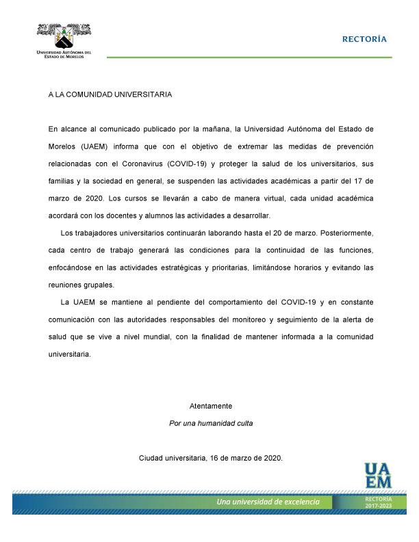 En alcance al comunicado emitido esta mañana, la Universidad Autónoma del Estado de Morelos #UAEM informa: se suspenden las actividades académicas a partir del 17 de marzo de 2020.
