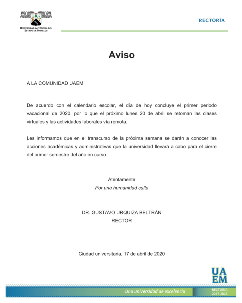 Atento aviso a la comunidad #UAEM De acuerdo con el calendario escolar, el día de hoy concluye el primer periodo vacacional de 2020, por lo que el próximo lunes 20 de abril se retoman las clases virtuales y las actividades laborales vía remota.