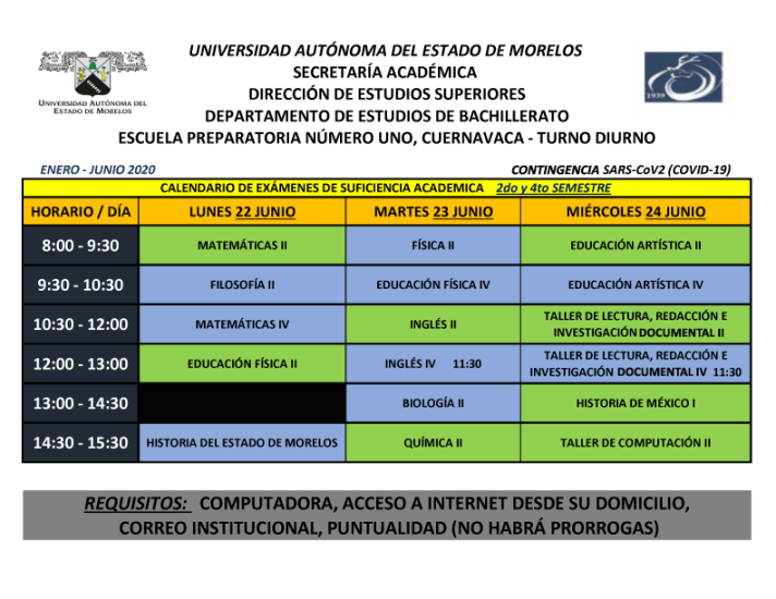 Estimados Alumnos de primer y segundo año, les compartimos el calendario de aplicación de los exámenes de suficiencia académica.