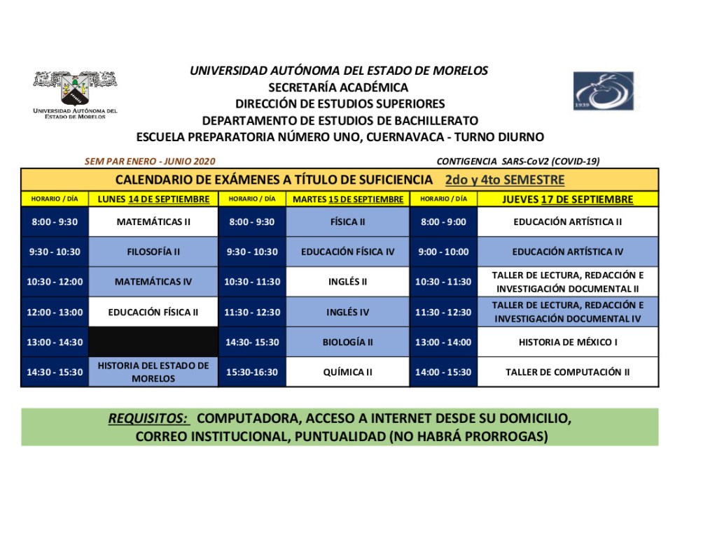 Les compartimos el calendario de aplicación de los exámenes a título de suficiencia de las materias de 2do y 4to semestre. Les recordamos que una vez que hayan realizado su pago deben de realizar su registro, el cual tiene como fecha límite el 12 de septiembre a las 18:00 hrs.