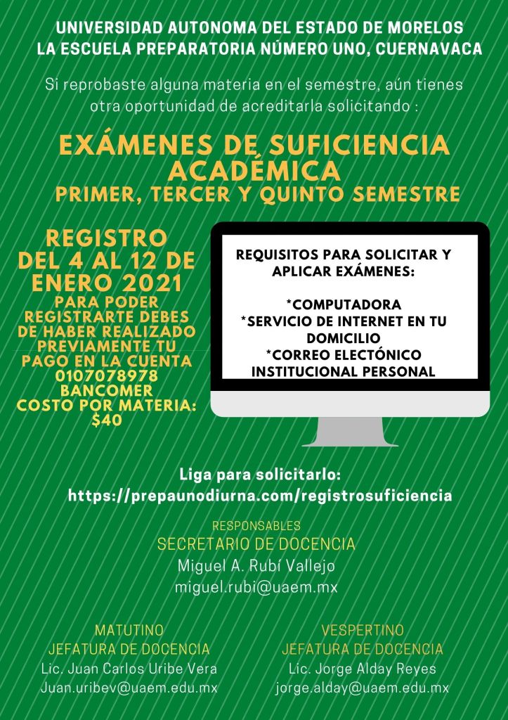 Atención alumnos, les compartimos la información para el pago y registro de los exámenes de suficiencia académica que corresponden a las materias de primer, tercer y quinto semestre del periodo ago-dic 2020. Comparte esto: Haz clic para compartir en X (Se abre en una ventana nueva) X Haz clic para compartir en Facebook (Se abre en una ventana nueva) Facebook Me gusta Cargando... Relacionado