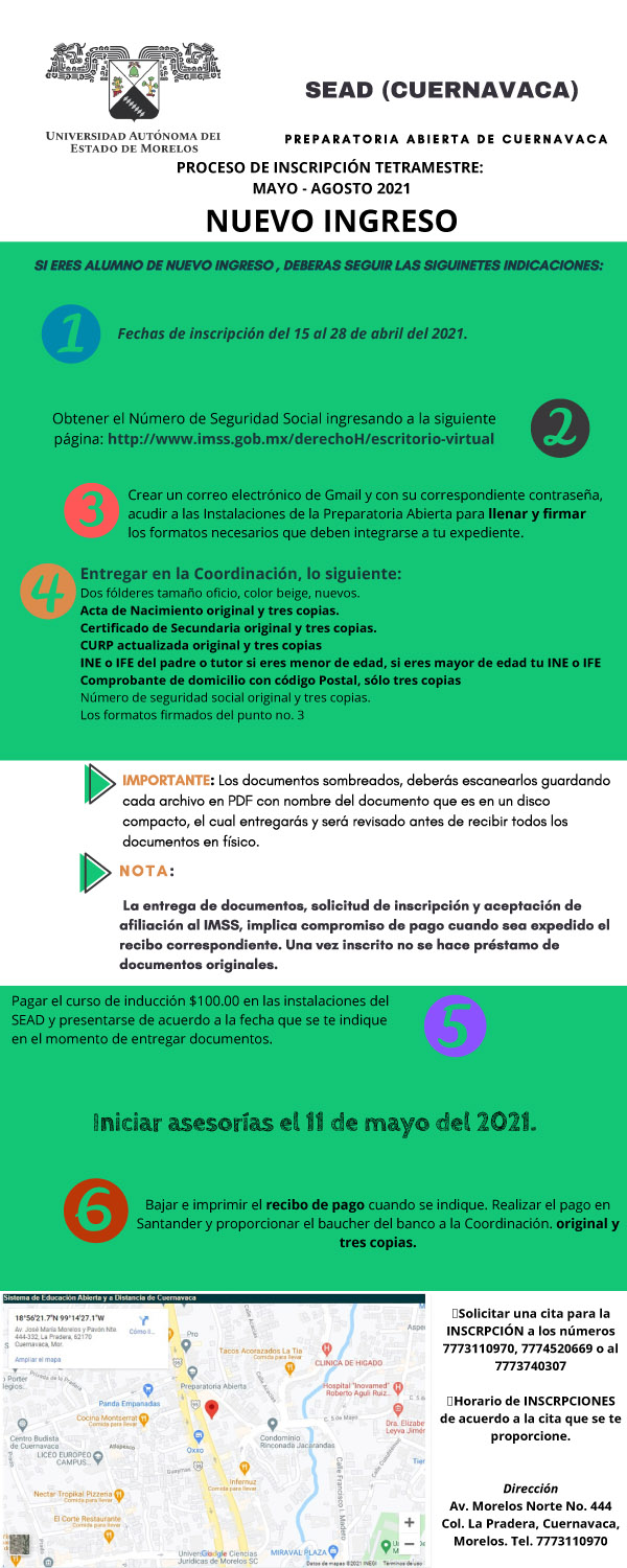 Les compartimos la convocatoria de nuevo ingreso y por revalidación a la Preparatoria Abierta de la Escuela Preparatoria Número Uno UAEM, SEAD CUERNAVACA, (Sistema de Educación a Distancia).