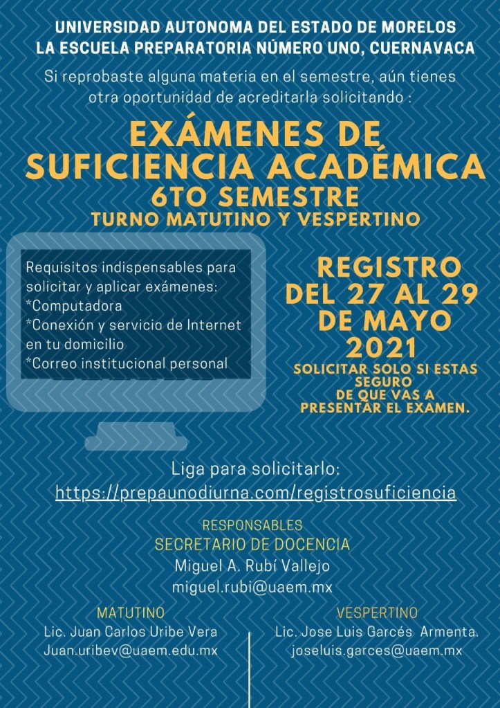 Les compartimos el enlace donde podrán realizar su registro para la aplicación del examen de SUFICIENCIA ACADÉMICA Suficiencia para los alumnos que están actualmente en 6to Semestre.