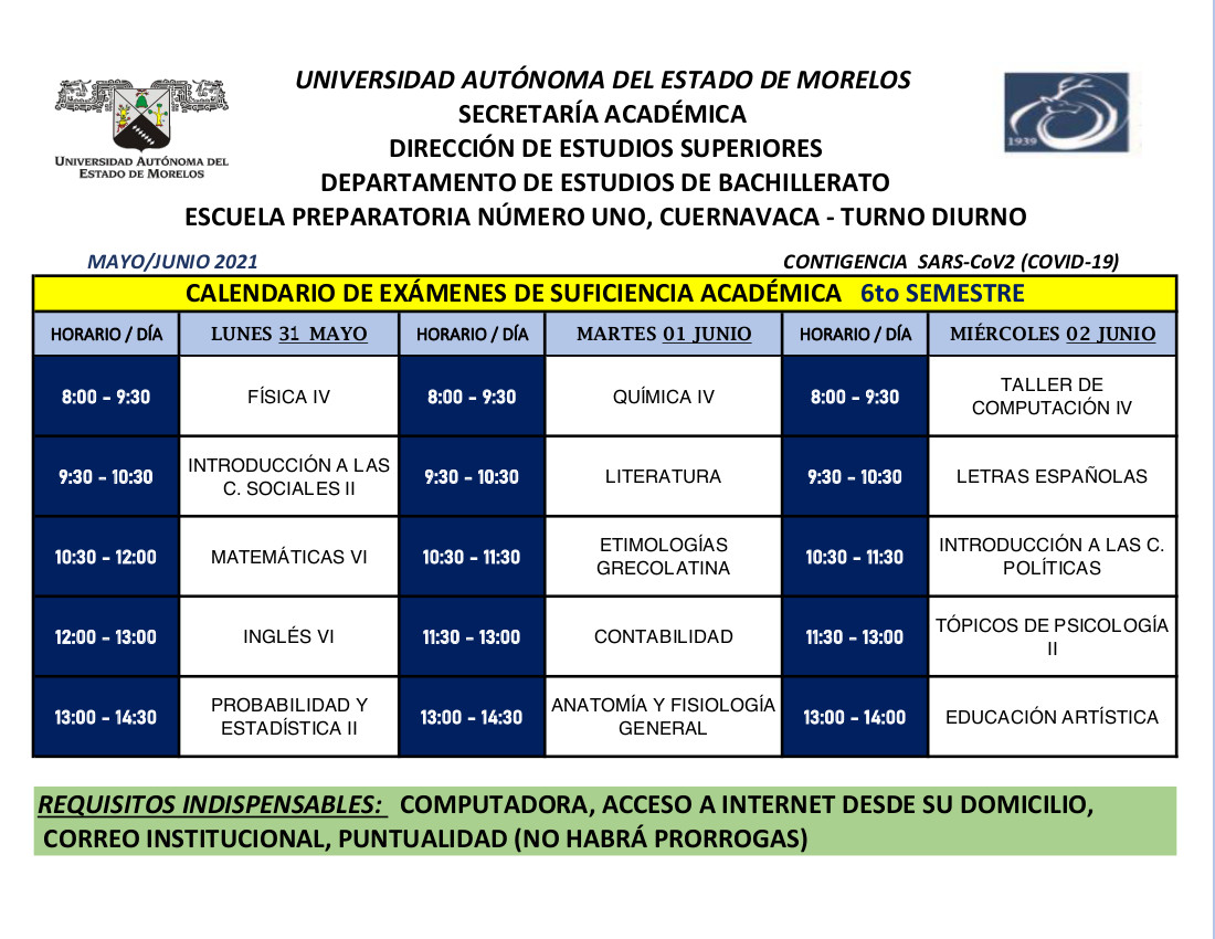 Les compartimos el calendario de aplicación de los exámenes de Suficiencia Académica para materias de 6to SEMESTRE.