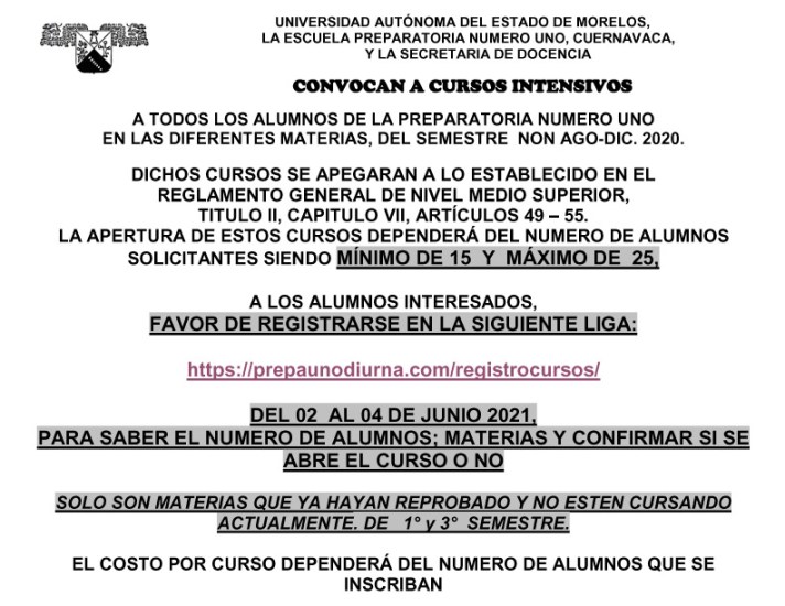 Les compartimos la convocatoria para cursos intensivos de materias de primer y tercer semestre.pueden realizar su solicitud en la liga: https://prepaunodiurna.com/registrocursos/