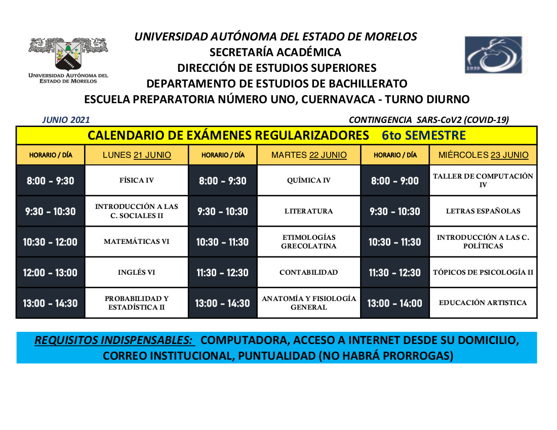 Les compartimos el calendario de aplicación de los exámenes Extraordinarios de sexto Semestre, los cuales comienzan el lunes 21 de Junio del 2021. Comparte esto: Haz clic para compartir en X (Se abre en una ventana nueva) X Haz clic para compartir en Facebook (Se abre en una ventana nueva) Facebook Me gusta Cargando... Relacionado