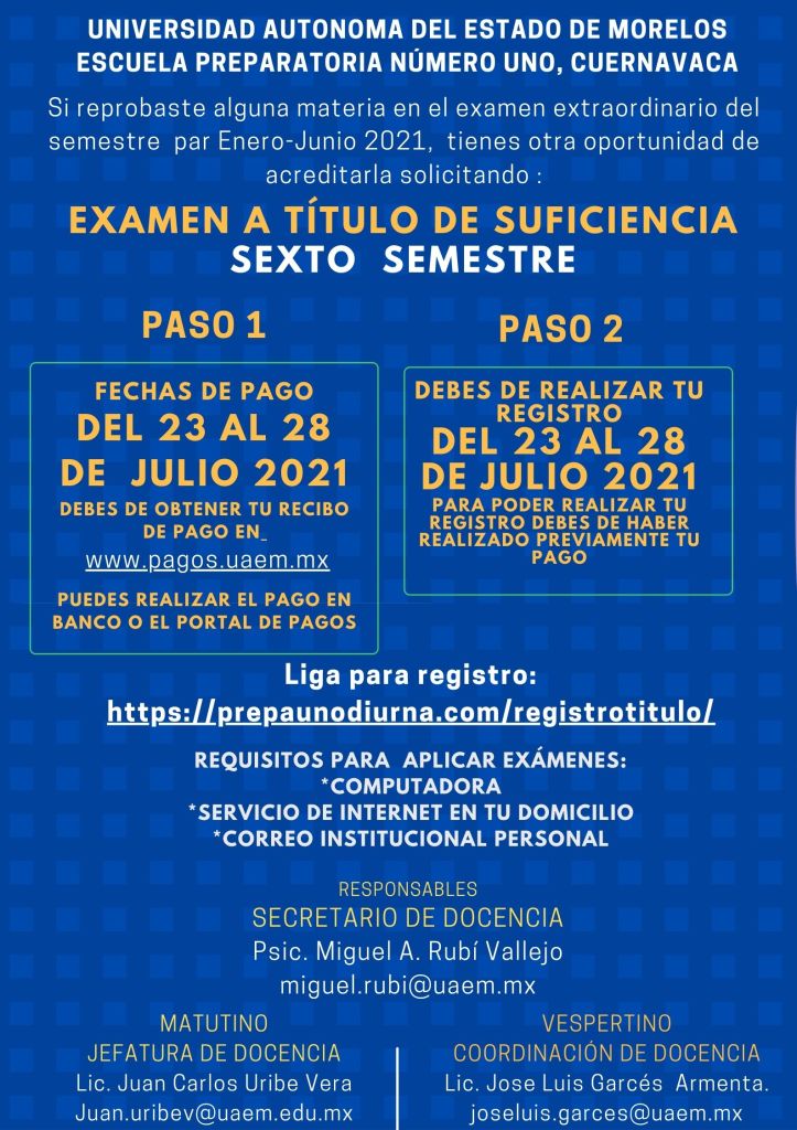 Les compartimos las fechas de PAGO Y REGISTRO para el examen a Título de Suficiencia para las materias de sexto semestre si es que reprobaron o no presentaron su examen extraordinario.