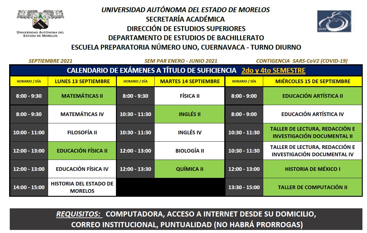 Les compartimos el calendario de aplicación de los exámenes a Título de suficiencia para materias de segundo y cuarto semestre, que inician el lunes 13 de septiembre.