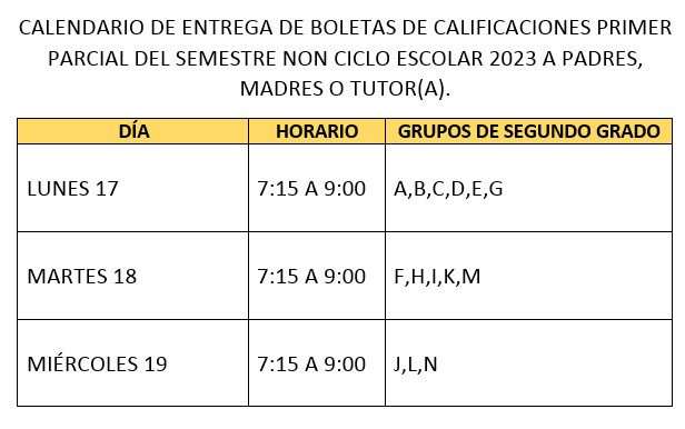 Estimados padres de familia, les informamos que los días Lunes 17, Martes 18 y Miércoles 19 de octubre se entregarán las boletas de calificaciones de los alumnos de segundo año, correspondientes al primer parcial del semestre agosto-diciembre. El horario de entrega será de 7:15 a 9:00 hrs en la techumbre de la preparatoria con la orientadora educativa del grupo. Por lo que les pedimos su asistencia de acuerdo al siguiente calendario: