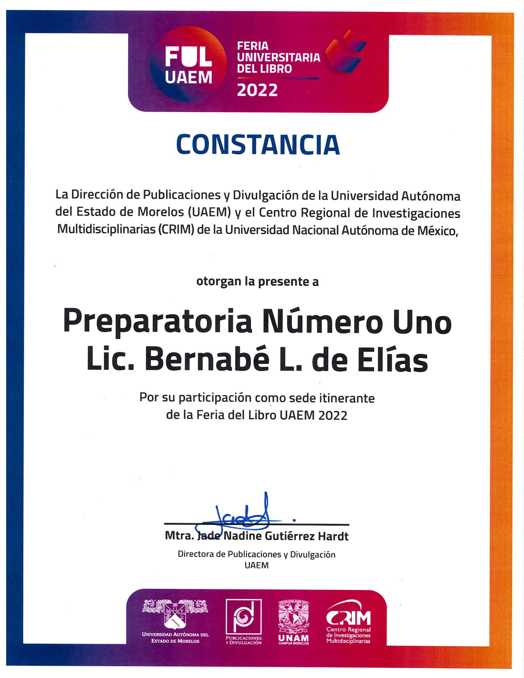 Recibe la Escuela Preparatoria Número Uno, Cuernavaca reconocimiento por la participación como sede itinerante de la Feria del Libro 2022 Comparte esto: Haz clic para compartir en X (Se abre en una ventana nueva) X Haz clic para compartir en Facebook (Se abre en una ventana nueva) Facebook Me gusta Cargando... Relacionado