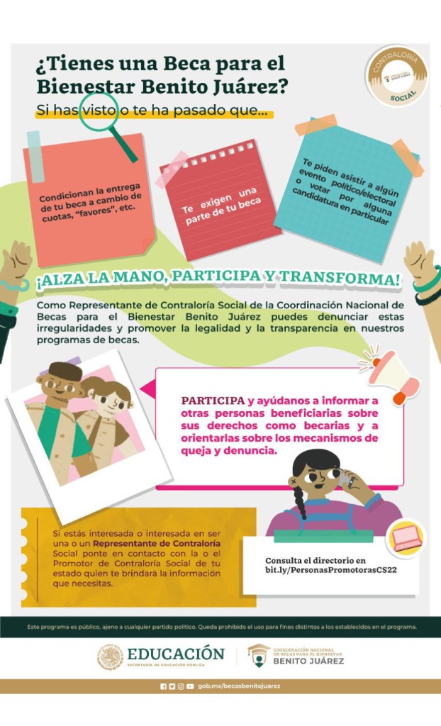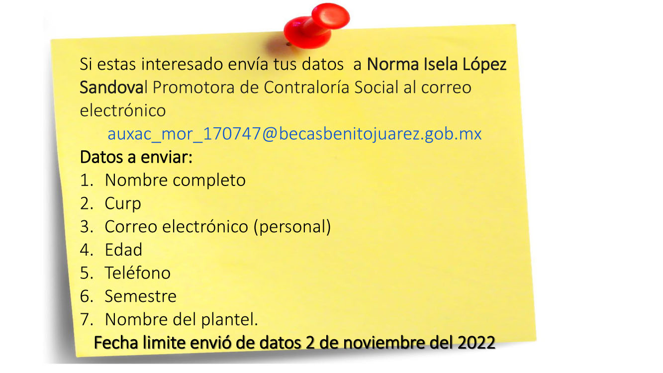 A todos los alumnos de la Preparatoria se les hace una atenta invitación para participar como REPRESENTANTES DE LA CONTRALORÍA SOCIAL de la Beca Benito Juárez. Comparte esto: Haz clic para compartir en X (Se abre en una ventana nueva) X Haz clic para compartir en Facebook (Se abre en una ventana nueva) Facebook Me gusta Cargando... Relacionado