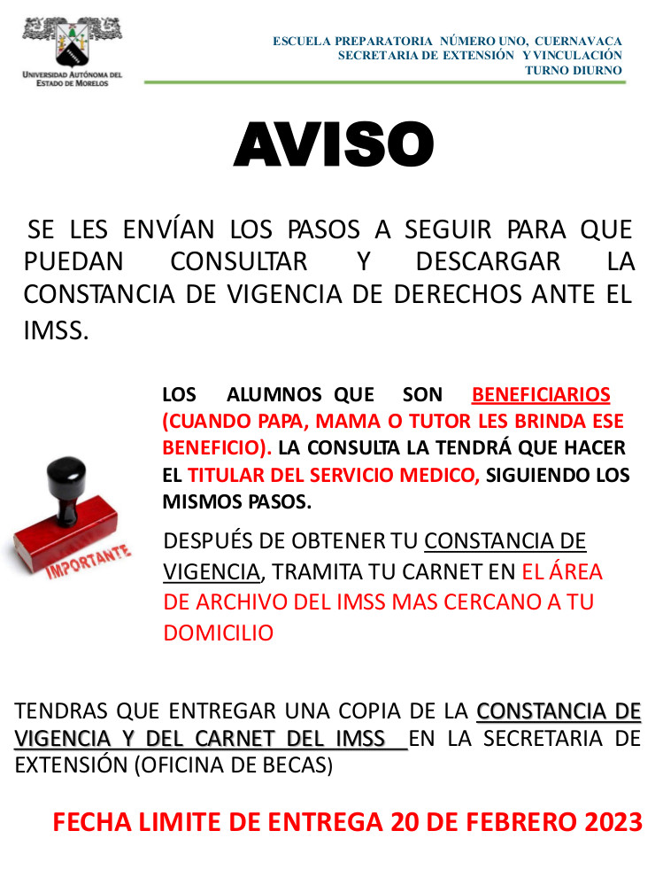 AVISO SE LES ENVÍAN LOS PASOS A SEGUIR PARA QUE PUEDAN CONSULTAR Y DESCARGAR LA CONSTANCIA DE VIGENCIA DE DERECHOS ANTE EL IMSS. Comparte esto: Haz clic para compartir en X (Se abre en una ventana nueva) X Haz clic para compartir en Facebook (Se abre en una ventana nueva) Facebook Me gusta Cargando... Relacionado