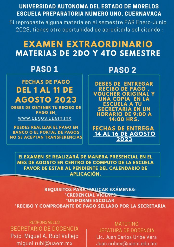 Estimados alumnos que deban materias de segundo y cuarto semestre, les compartimos la información sobre los exámenes extraordinarios. Comparte esto: Haz clic para compartir en X (Se abre en una ventana nueva) X Haz clic para compartir en Facebook (Se abre en una ventana nueva) Facebook Me gusta Cargando... Relacionado