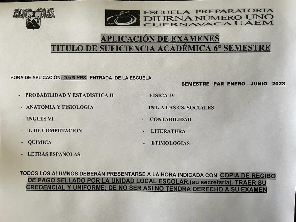 Estimados alumnos de sexto semestre les compartimos el calendario de aplicación de los exámenes a título de suficiencia los cuales se realizarán el martes 15 de agosto de manera presencial en la escuela.