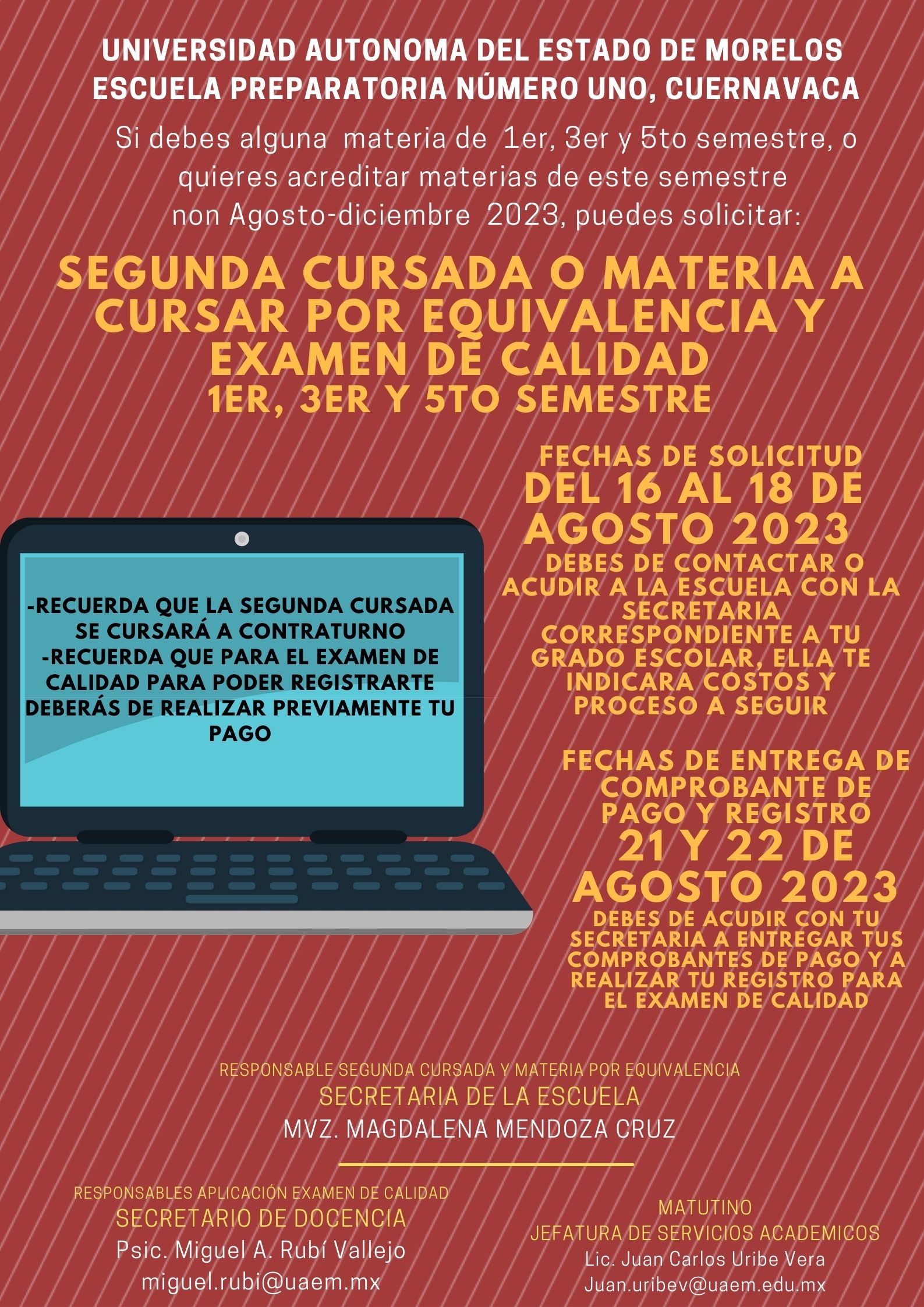 Les compartimos información para segunda cursada o materia por equivalencia para materias de semestres 1er, 3ero y 5to. Asi como para solicitar el examen de calidad. Comparte esto: Haz clic para compartir en X (Se abre en una ventana nueva) X Haz clic para compartir en Facebook (Se abre en una ventana nueva) Facebook Me gusta Cargando... Relacionado