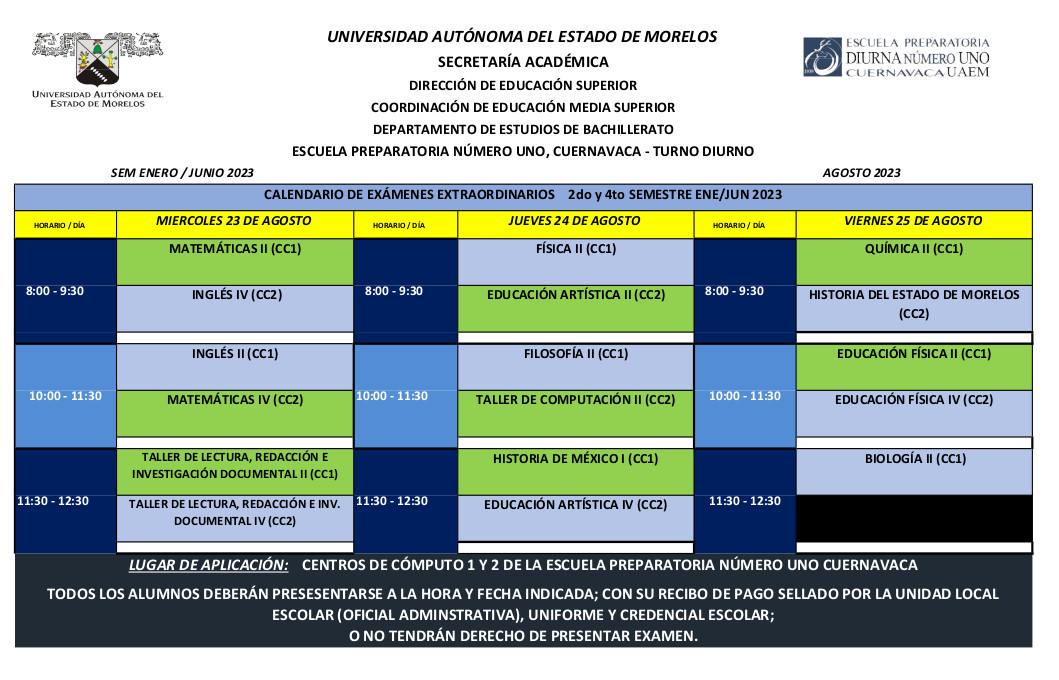 -TODOS LOS ALUMNOS DEBERÁN PRESENTARSE A LA HORA Y FECHA INDICADA; CON SU RECIBO DE PAGO SELLADO POR LA UNIDAD LOCAL ESCOLAR (OFICIAL ADMINISTRATIVA), UNIFORME Y CREDENCIAL ESCOLAR; O NO TENDRÁN DERECHO DE PRESENTAR EXAMEN.