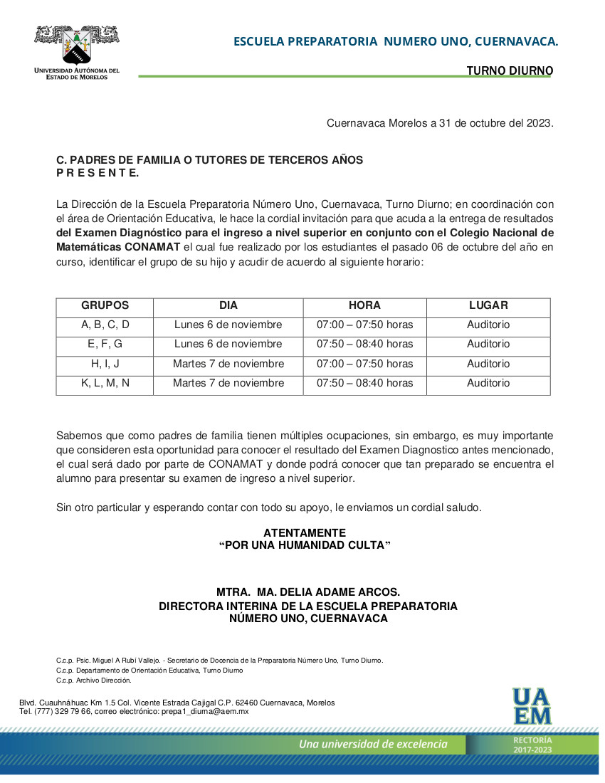 La Dirección de la Escuela Preparatoria Número Uno, Cuernavaca, Turno Diurno; en coordinación con el área de Orientación Educativa, le hace la cordial invitación para que acuda a la entrega de resultados del Examen Diagnóstico para el ingreso a nivel superior en conjunto con el Colegio Nacional de