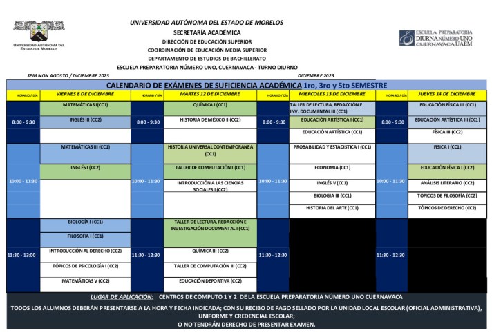 Estimados Alumnos les compartimos el calendario de aplicación de los Exámenes de Suficiencia Académica, los cuales comienzan el día 8 de Diciembre. Les comentamos que la fecha límite para entregar su recibo y comprobante de pago es el 6 de diciembre.