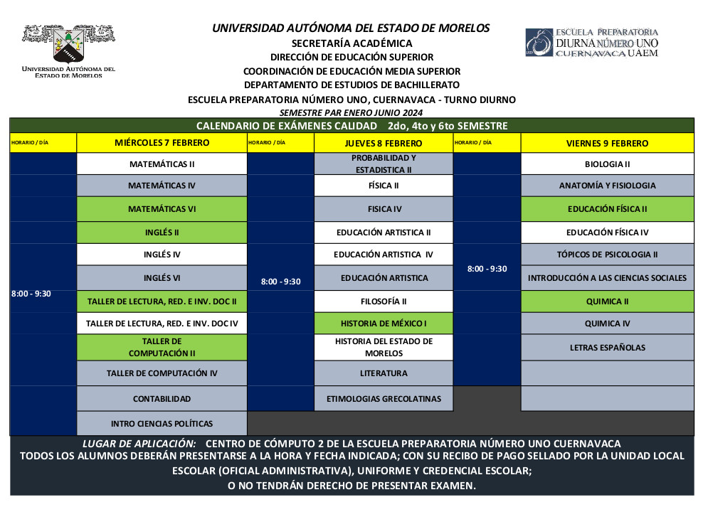 Estimados alumnos, les compartimos el calendario de aplicación de los Exámenes de Calidad de materias del semestre par enero-junio 2024.