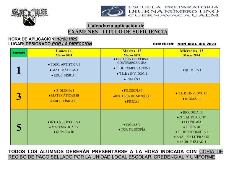 Estimados alumnos, les compartimos el calendario de aplicación de los Exámenes de Titulo de Suficiencia Académica, los cuales inician el lunes 11 de marzo del presente año. Les pedimos estar al pendiente de jefes de grupo o acudir a la dirección escolar para conocer en que salón se van a aplicar y si el horario es diferente.