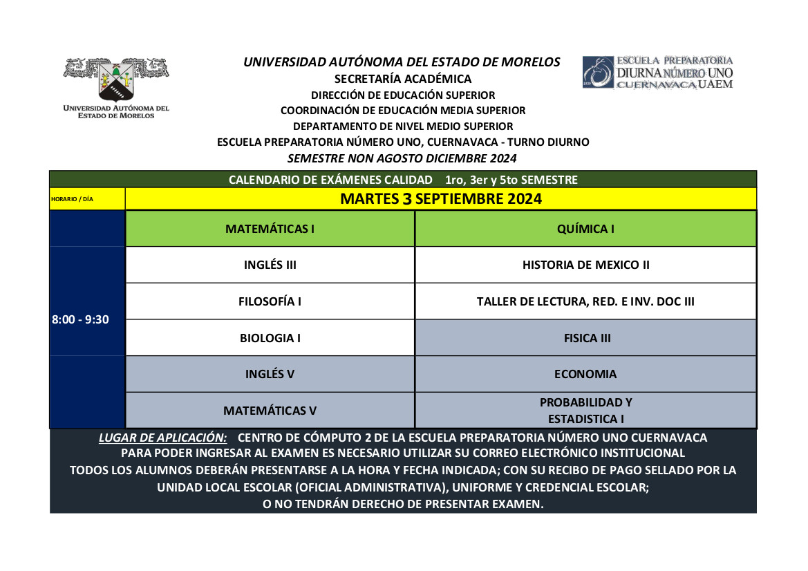 Les compartimos el calendario de los exámenes de calidad, de materias de primer, tercer y quinto semestre los cuales se van a aplicar el día 3 de septiembre. Les recordamos llevar uniforme, credencial escolar y que su correo institucional esté funcionando.