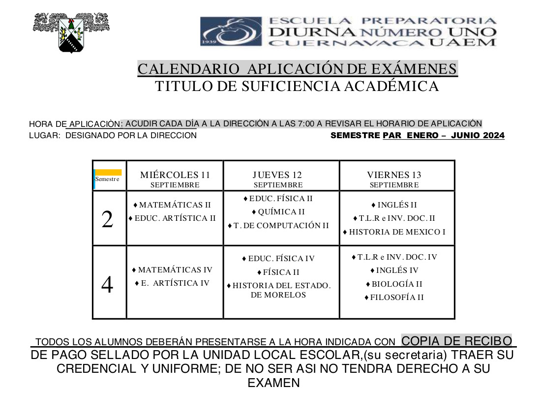 Estimados alumnos les compartimos el Calendario de aplicación de los Exámenes a Titulo de suficiencia de materias de 2do y 4to semestre, estos se aplicarán del 11 al 13 de septiembre. Para revisar el horario y lugar de aplicación les solicitamos suban a la dirección de la escuela, a las 7:00 am para que verifiquen la hora y lugar de aplicación de dichos exámenes.