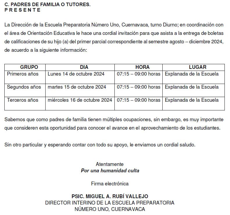 Estimados tutores y padres de familia la Dirección de la Escuela Preparatoria Número Uno, Cuernavaca, turno Diurno; en coordinación con el área de Orientación Educativa le hace una cordial invitación para que asista a la entrega de boletas de calificaciones de su hijo (a) del primer parcial correspondiente al semestre agosto – diciembre 2024.