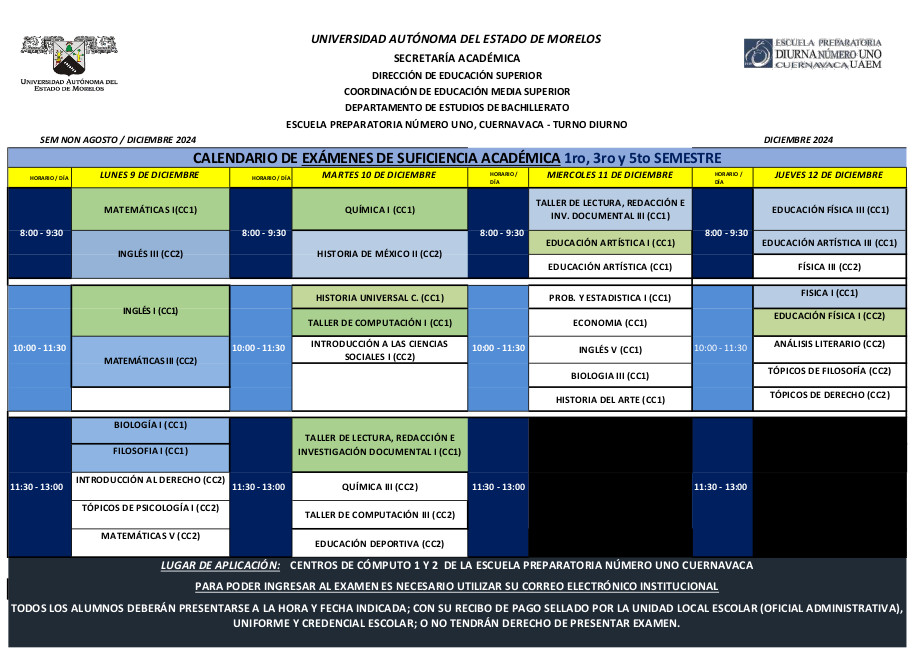 Les compartimos el calendario de aplicación de los exámenes DE SUFICIENCIA de materias de primer, tercer y quinto semestre, los cuales inician el lunes 9 de diciembre 2024.