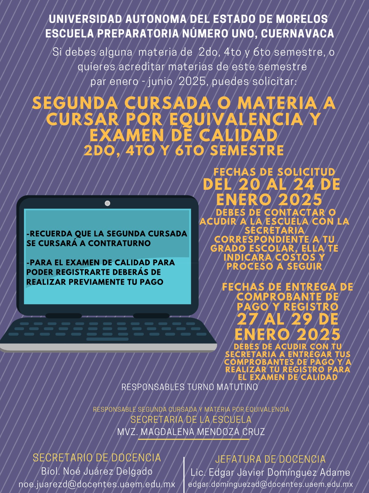 Estimados alumnos les compartimos el cartel para cursar por segunda ocasión materias, cursar por equivalencia y/o examen de solvencia o calidad, correspondiente al semestre Par_2025 , en dicho cartel se establecen las fechas de pago y entrega de los comprobantes.